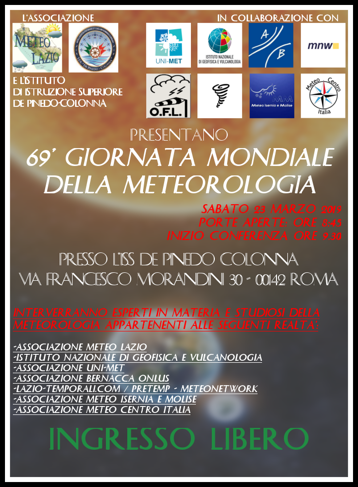 Sabato 23 marzo 2019 andrà in scena la 69esima Giornata Mondiale della Meteorologia e come soventemente accade saranno numerose le manifestazioni tenute, da esperti e non, per festeggiare questo magnifico "compleanno".