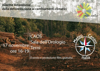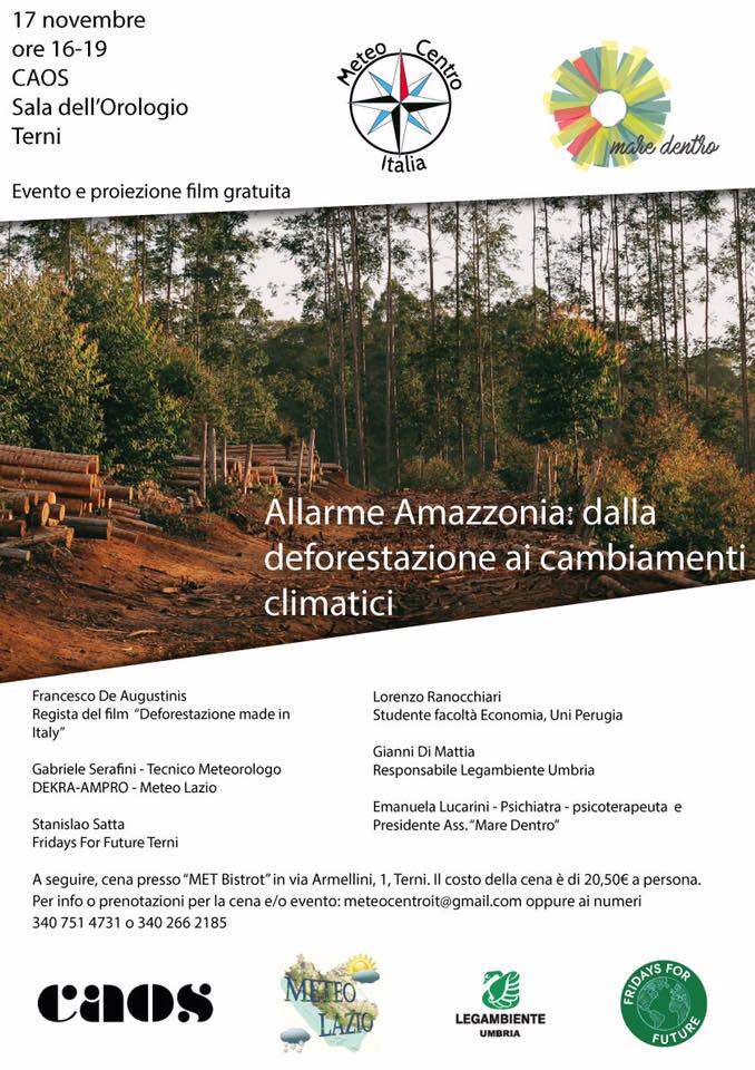 L’Associazione Meteo Centro Italia e l’associazione Mare Dentro, in collaborazione con il CAOS centro arti opificio siri e il regista Francesco de Augustinis, propone alla città di Terni un evento interamente dedicato alla problematica della deforestazione in Amazzonia, al fragile rapporto tra uomo e natura, e a quali cambiamenti climatici rischiamo di andare incontro nel nostro futuro.