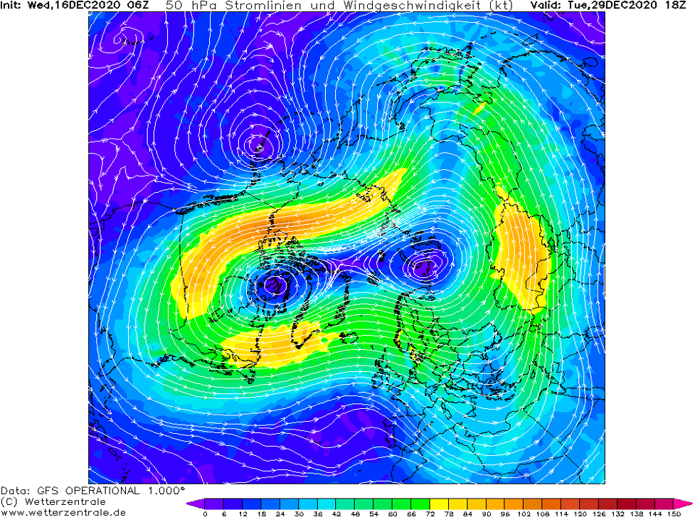 Successivamente, tra Natale e Capodanno, potremmo assistere ad un lieve rialzo delle temperature seppur rimanendo in un contesto molto perturbato. Sarà da tenere in considerazione la risalita verso latitudini nord atlantiche dell’alta pressione azzorriana che al momento i modelli, per quel periodo, collocano in Atlantico a ridosso delle coste del Regno Unito e con una discreta influenza in area Mediterranea. Ovviamente, dovremmo attendere conferme dai modelli previsionali, perché a guardare anche l’evoluzione del Vortice Polare scopriamo immediatamente che per quel periodo i modelli prevedono un deciso split (suddivisione) in due vortici ben strutturati alla quota di 50HPa (>20Km) come si può vedere dalla immagine sotto che non esclude quindi episodi freddi anche marcati verso le nostre latitudini.