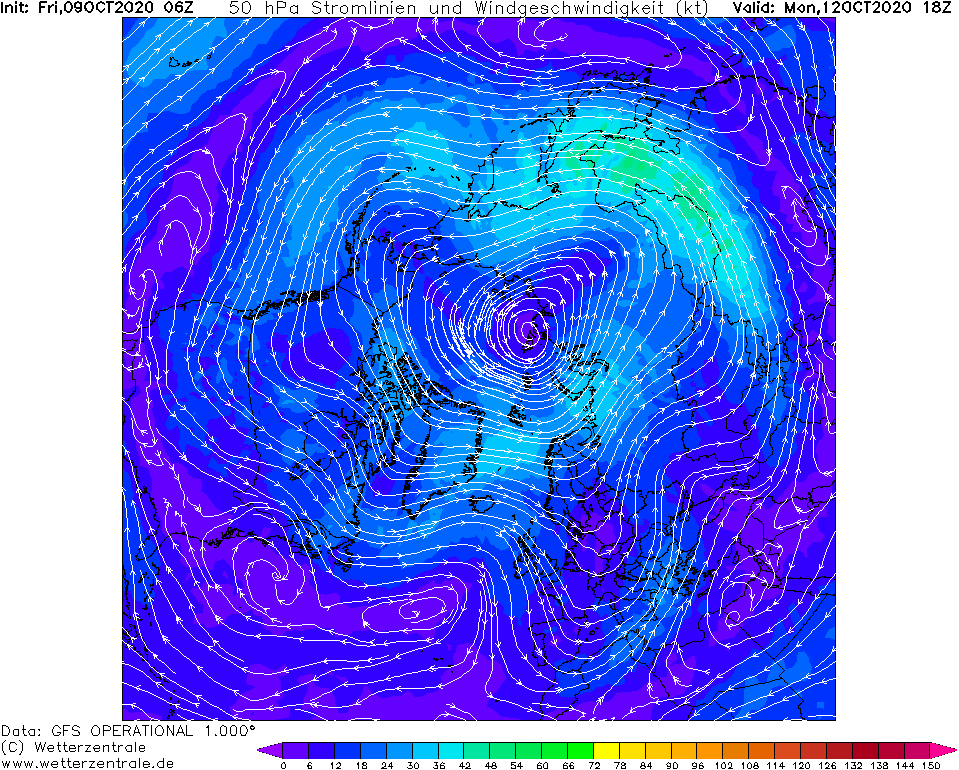 Dalla carta sottostante possiamo osservare i venti in quota previsti a 50Hpa (30km) dove la circolazione atmosferica subirà un forte disturbo per la presenza sul Nord America di una profonda depressione.