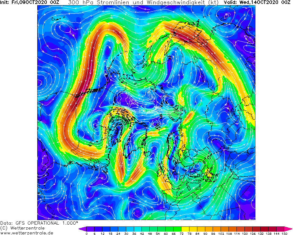 Dalla carta sottostante a 300Hpa (6-8KM) è evidente la traiettoria ondulata del Jet Stream che si andrà a formare nella circolazione atmosferica circumpolare con la formazione sull’Europa e l’area mediterranea di una profonda saccatura.