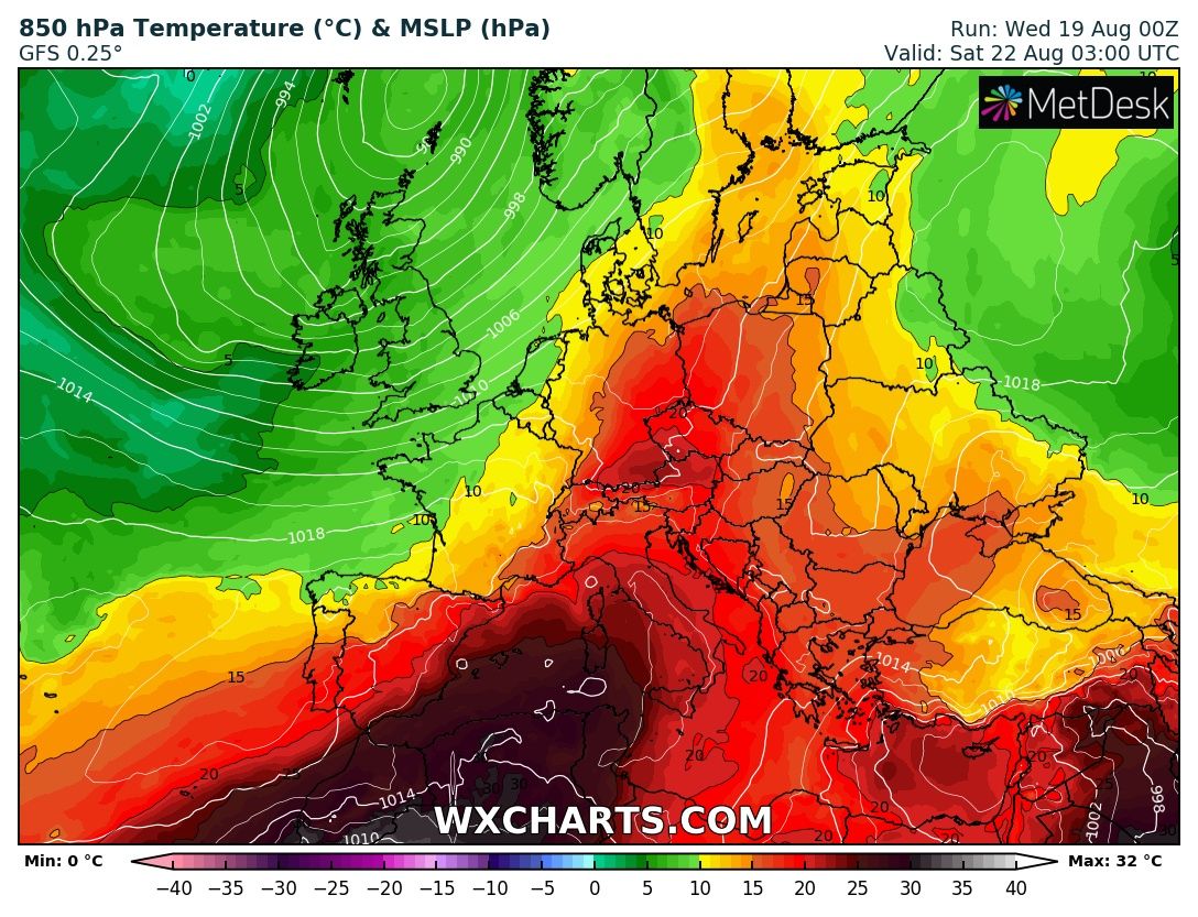 Le temperature in quota raggiungeranno valori di +20/23 gradi a 850 hpa (circa 1500 metri di quota), mentre al suolo le temperature probabilmente arriveranno a sfiorare i 37/40 gradi in molte località.