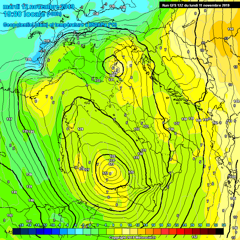 Nelle immagini è possibile osservare la situazione sinottica e termica per la serata di domani, martedì 12 novembre 2019.