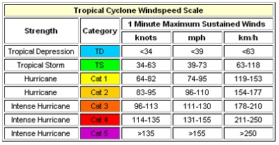 Sempre in base alla velocità del vento possiamo dire che siamo in presenza di una depressione tropicale, qualora i venti siano inferiori ai 60 km/h, o di una tempesta tropicale, nel caso in cui le raffiche siano comprese fra i 60 e i 120 km/h.