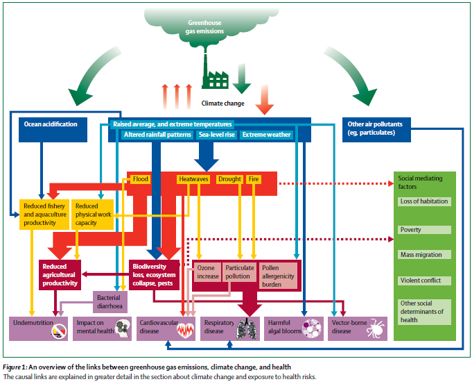 Pochi mesi fa il Lancet - una delle più importanti riviste nell’ambito medico - ha pubblicato una review in merito, ossia un articolo in cui riunisce tutti i contributi scientifici pubblicati su questo argomento da autori accreditati. Nell’articolo si trova questo schema che riassume bene come l’aumento delle emissioni dei gas serra possa impattare sulla salute: