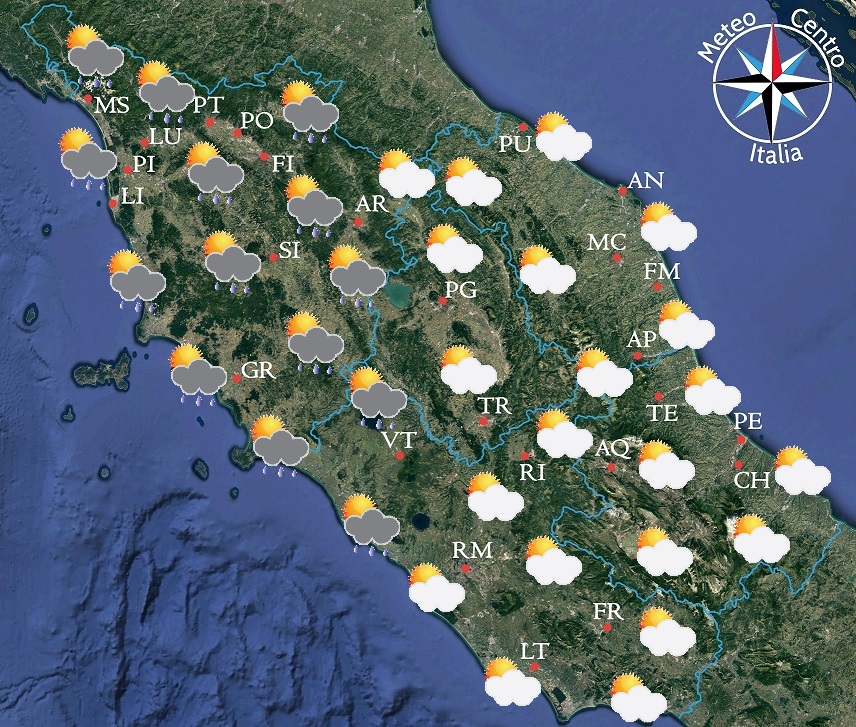 Questa provocherà un aumento della copertura nuvolosa lungo tutte le regioni Tirreniche, solo raramente associata a brevi fenomeni precipitativi possibili nella giornata di sabato sulla Toscana e sul Lazio settentrionale. La ventilazione sarà in rinforzo dai quadranti meridionali in modo particolare lungo le coste, dove le raffiche potranno raggiungere i 50-60 km/h. Termicamente parlando invece non si avranno grandi cambiamenti con le temperature che si manterranno pressoché stazionarie.