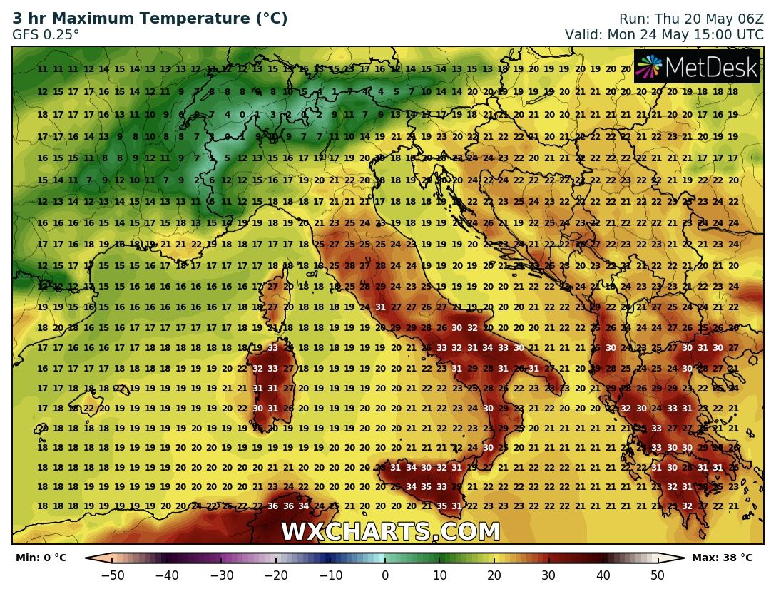 Tra domenica e lunedì, invece, un ulteriore spinta dell'alta pressione verso nord est determinerà l'avvento sull'Italia centro meridionale di aria molto calda, di origine africana. Proprio in questi giorni raggiungeremo l'apice del caldo quota, e di conseguenza anche al suolo, con l'isoterma dei 20 gradi a 850 hpa (circa 1500 metri di quota) che abbraccerà tutto il sud Italia. Sulle regioni meridionali si potranno agevolmente superare i 30 gradi centigradi, mentre su quelle centrali le colonnine di mercurio si fermeranno poco al di sotto dei 30 gradi. Tuttavia, come soventemente accade in questi casi, l'apice della rimonta calda, dall'altro lato, verrà accompagnato da un generale aumento della copertura nuvolosa, associato, localmente, a qualche innocuo piovasco.