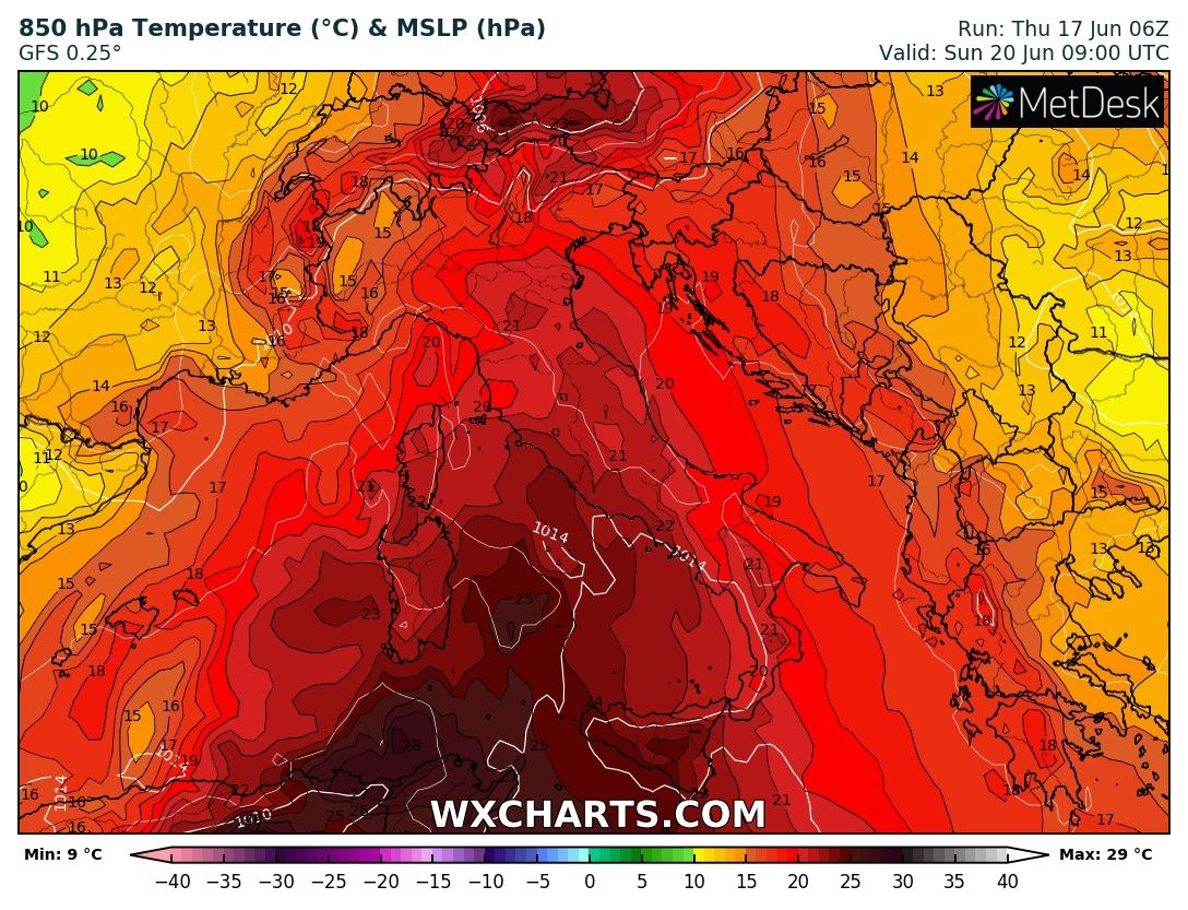 Dal fine settimana, invece, l'alta pressione tenderà a rinforzarsi ulteriormente e con un preponderante contributo africano. Infatti, a partire da sabato, una bolla calda africana si dirigerà verso l'Italia determinando un ulteriore aumento delle temperature sia in quota che al suolo. Almeno fino a martedì le temperature potranno sfiorare a più riprese i 40 gradi su molte località del centro Italia (fig. 2).
