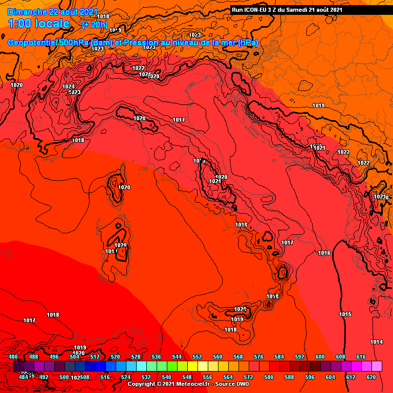 In questa immagine è possibile apprezzare l'espansione dell'alta pressione su tutta la penisola italica, contrassegnata da alti valori di geopotenziale.