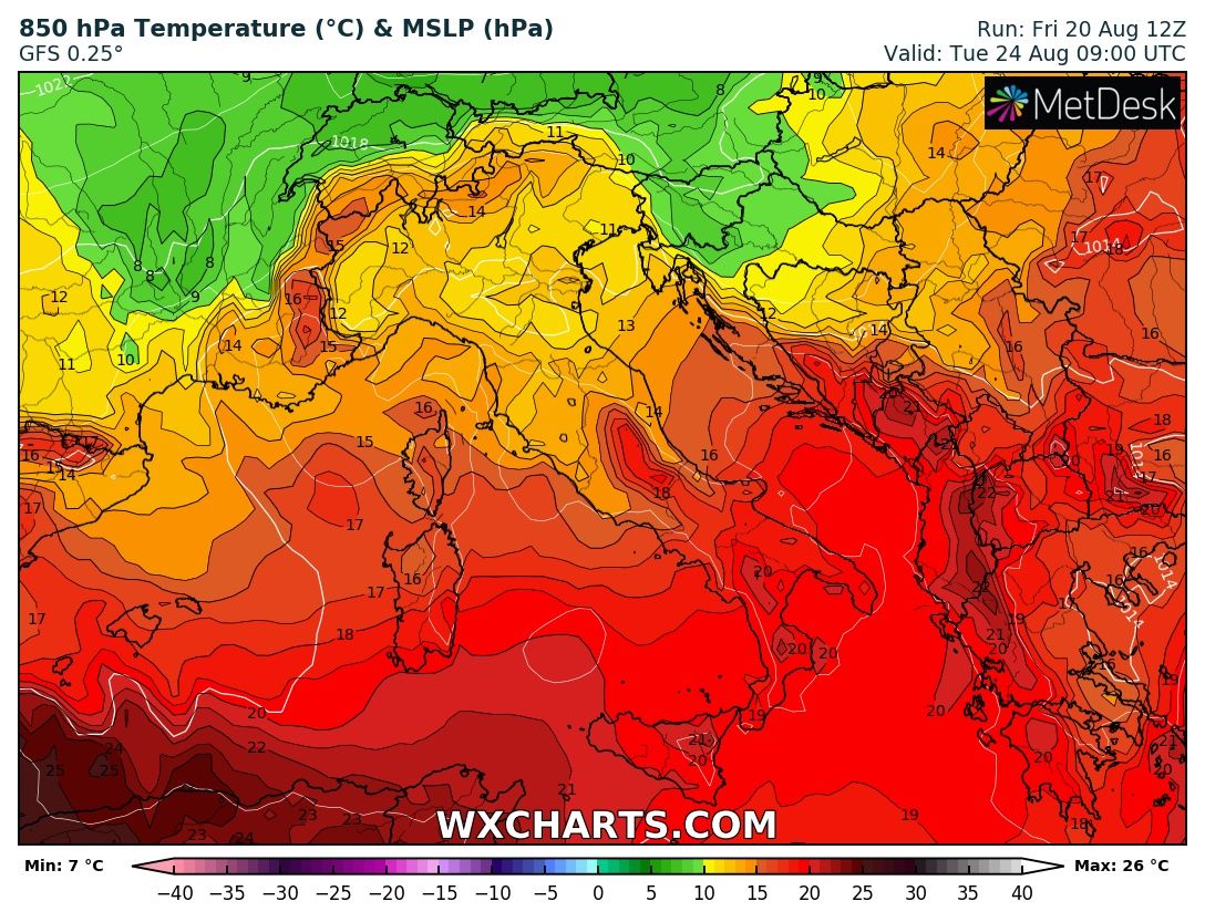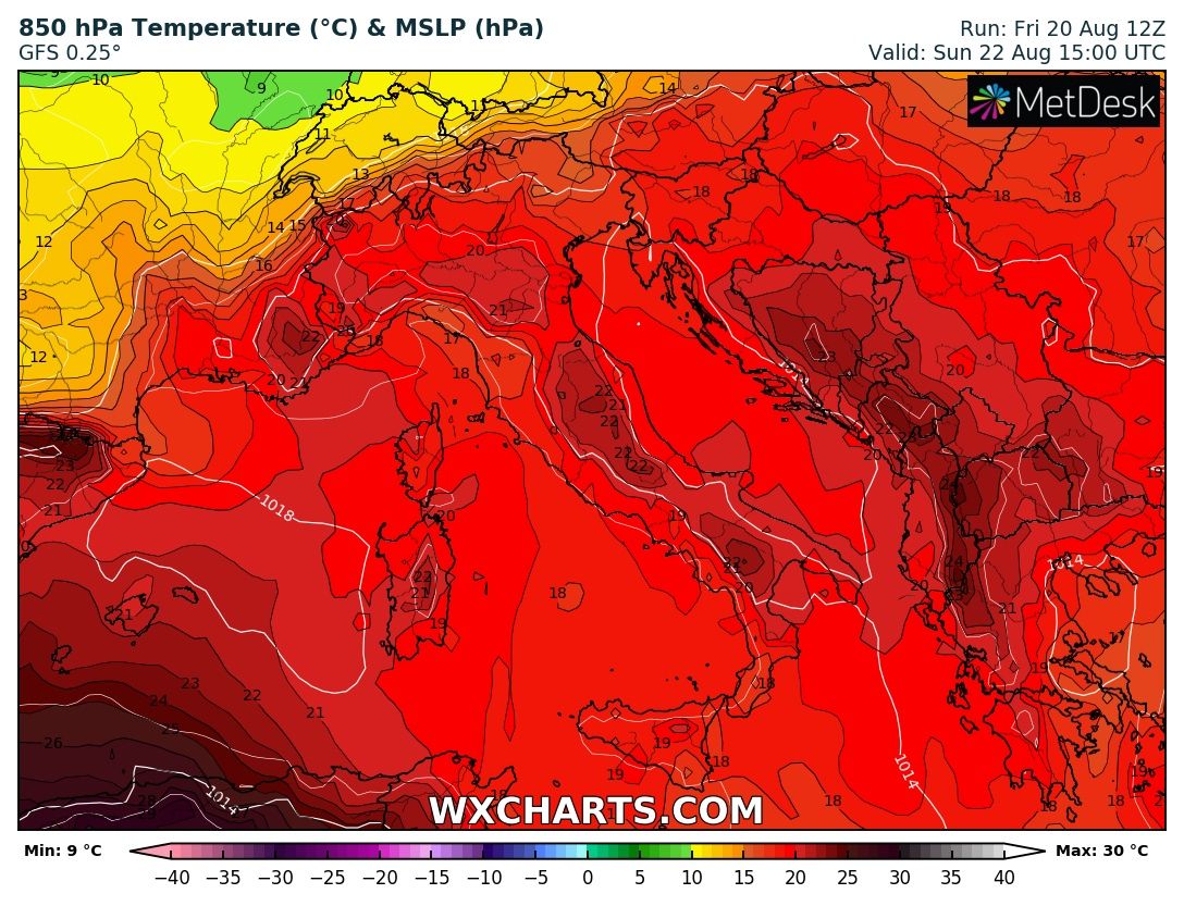 Nelle prossime 24/36 ore, quindi all'incirca fino al pomeriggio di lunedì, l'alta pressione si espanderà ulteriormente verso ovest determinando un nuovo aumento delle temperature su tutta la penisola, centro Italia compreso. I valori, come potete vedere nell'immagine sottostante, saranno comunque inferiori rispetto a quelli avuti fino alla scorsa settimana, ma saranno sufficienti a regalarci qualche giorni di ulteriore sofferenza, specialmente nelle ore diurne.