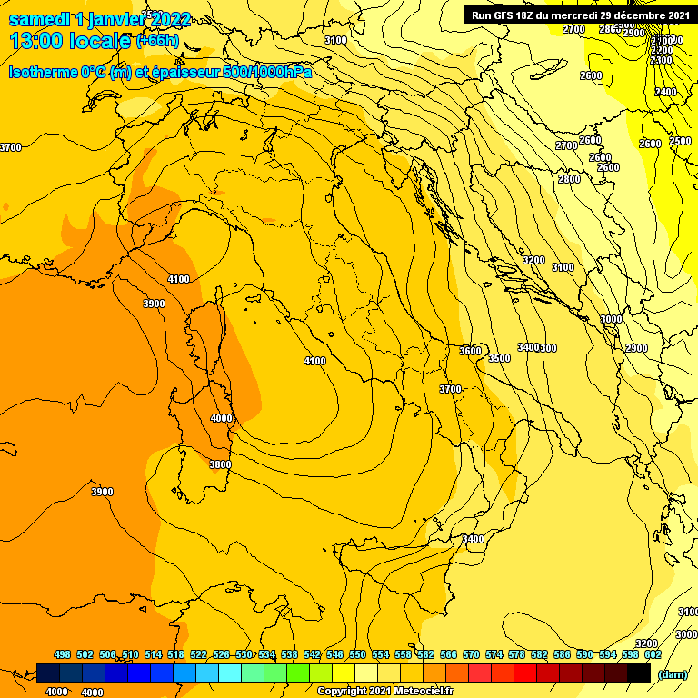 Le isoterme in quota ad 850hpa (1400 metri) raggiungeranno valori davvero molto elevati, degni della fine di maggio, tra Spagna, Francia meridionale, ma anche gran parte del nostro paese, in particolare nord ovest e centrali tirreniche, maggiormente vicine al fulcro dell'alta pressione. Anche lo zero termico tenderà ad attestarsi su quote davvero incredibili per il periodo, superiore ai 3500 metri e localmente anche ai 4000 metri, cosa che solitamente si riscontra nel trimestre estivo e di certo non ad inizio inverno (vedi immagine sottostante).