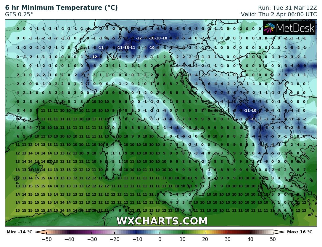 La mattinata più a "rischio" sarà quella di domani, giovedì 2 aprile 2020, quando gelate diffuse potrebbero interessare le zone interne e pianeggianti di Toscana, Umbria, Lazio e Abruzzo (come visibile in figura). Il tutto sarà agevolata dalla graduale attenuazione della ventilazione, che permetterà la formazione del fenomeno dell'inversione termica nelle zone pianeggianti.