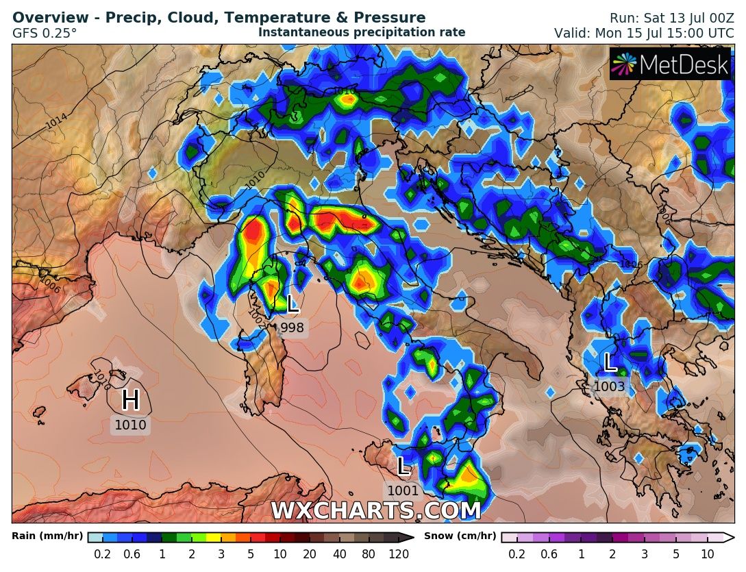 Infatti, fra la notte di domenica e il mattino di lunedì, prenderà vita un vortice depressionario davanti al golfo di Genova, che dapprima porterà instabilità diffusa su tutte le regioni settentrionali e in particolare modo su quelle di nord ovest, per poi spingersi verso sud e interessare, nelle ore pomeridiane di lunedì, tutto il centro Italia.